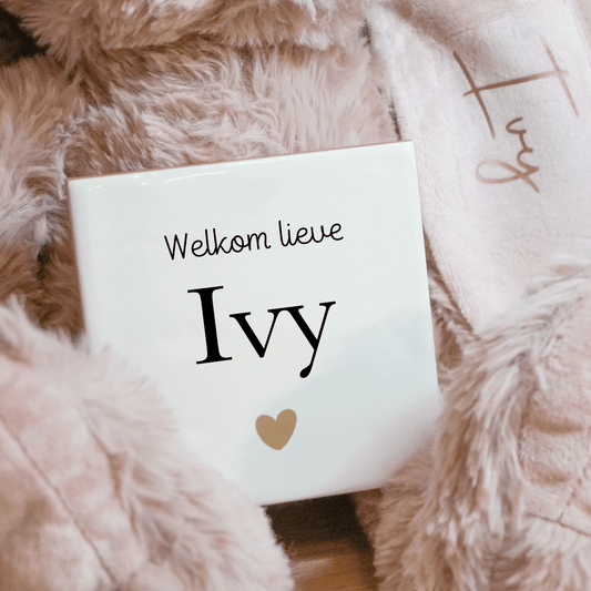 Gepersonaliseerd Knuffelkonijn Beige + Geboorte tegeltje | Uniek kraamcadeau