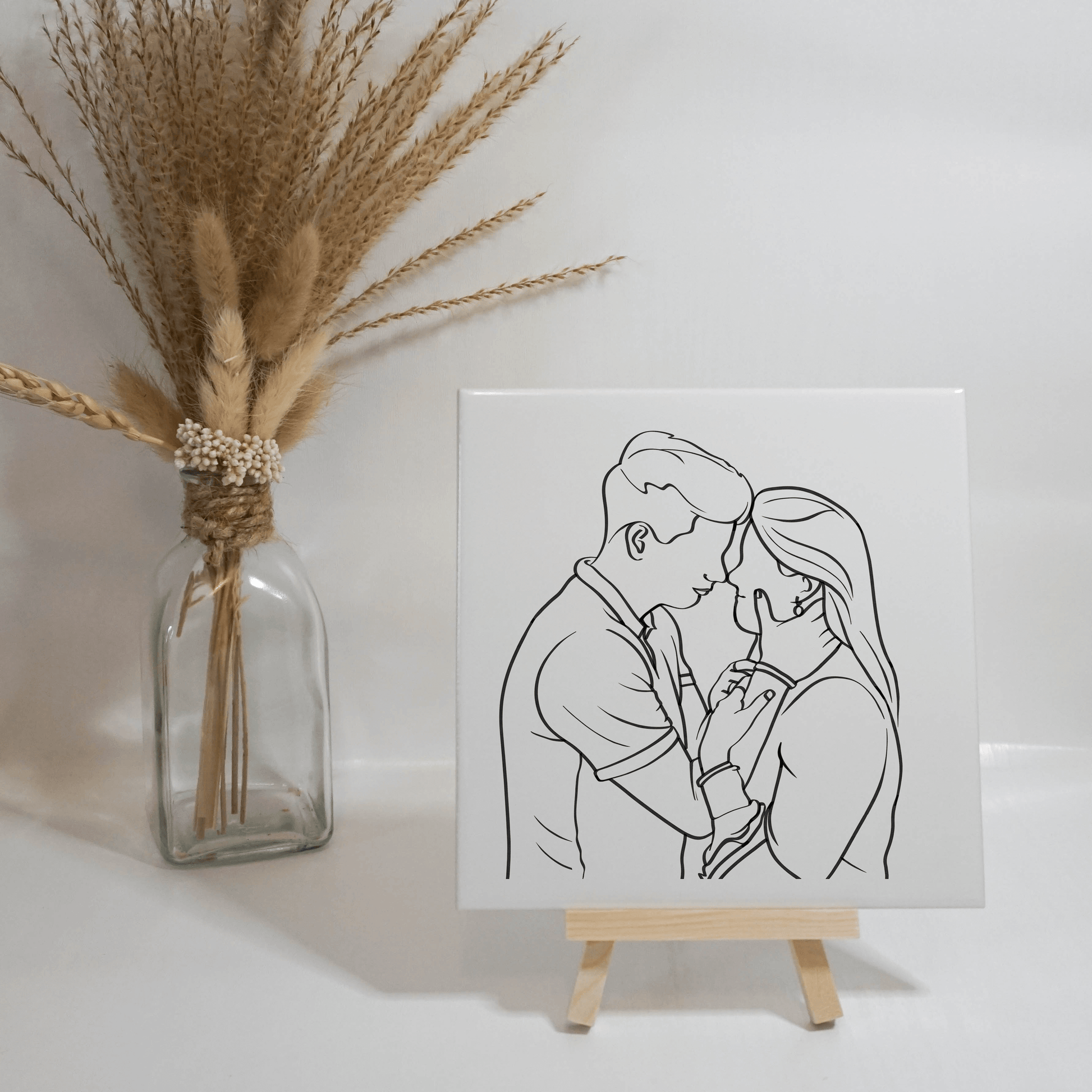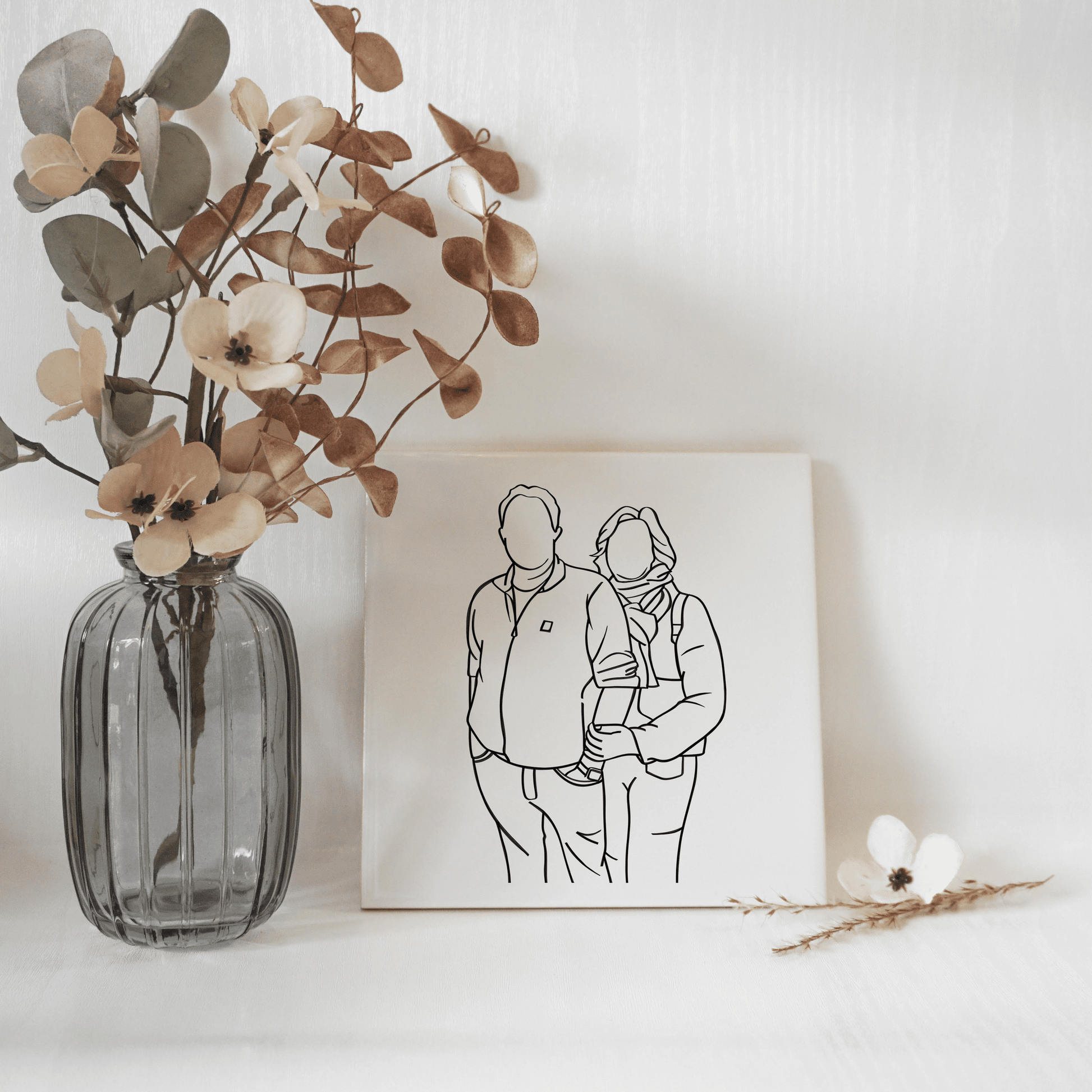 We transformeren jouw foto in een line art illustratie en plaatsen dit met zwart vinyl op een witte keramische tegel van 15x15cm.
